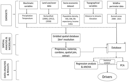 We developed a methodology to examine the temporal and spatial patterns of wildfires in Spain, focusing on the frequency of fires and the extent of burned areas. A flowchart of the stepwise methodology is presented in detail in the diagram below (Figure 2). Initially, the process involved consolidating all datasets into a unified database to define criteria for fire size, enabling the evaluation of burned areas and fire counts. We conducted spatial and statistical analyses on historical bioclimatic variables, wildfire perimeters from 2008 to 2021, CORINE land cover data for 2006, 2012, and 2018 at six-year intervals, population density figures for 2010, 2015, and 2020 at five-year intervals, and digital elevation model (DEM) data. Linear regression and one-way ANOVA were employed for all datasets to investigate variable correlations. Then, PCA was applied in the second phase to establish connections between dependent and independent variables. Data processing, analysis, and visualisation were performed using ArcGIS version 10.7 and R software version 4.3.1.