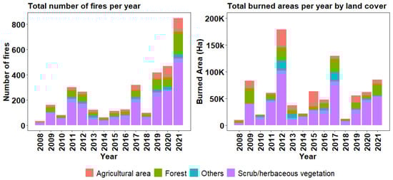 Change in number of fires (for fires with burned area ≥ 30 Ha) per year by land cover (left) and burned areas (right) per year by land cover classes in Spain through the study period (2008–2021).