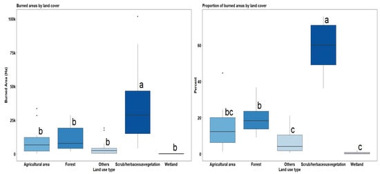 Boxplot of distribution of total burned areas in Spain by land cover types (left) and proportion of land cover burned (right) through the study period (2008–2021). The land cover types whose means are statistically different at α = 0.05 are in different letters, while colour transparency denotes a difference in median values.