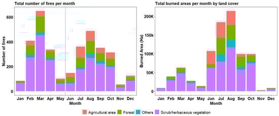 The monthly burned areas show the concentration of large fires towards the summer periods (from July to October). Unlike the number of fires that show two distinct periods, the monthly burned areas’ distribution shows a higher number of burned areas in the summer, which peaks in August (Figure 5, right). Therefore, while the summer and spring seasons drive the number of wildfires, the size of fires is more favoured during the summer.
