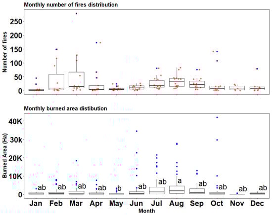 Distribution of monthly fire frequencies (top) and burned areas (bottom) in Spain (red dots represent observations while outliers are in blue). For each month, we have a distribution of a historical number of fires and burned areas over 2008–2021. The burned areas whose means are statistically different at α = 0.05 are in different letters.