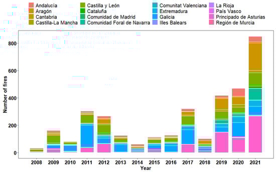 Temporal sequence of the total number of fires (fires with burned area ≥ 30 ha) per region during the study period from 2008 to 2021, with each colour denoting the specific fire count for each region.