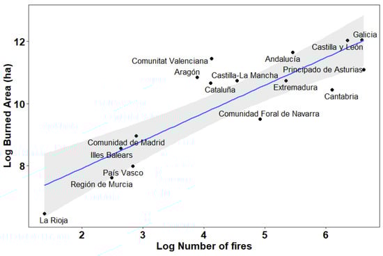 Regression relationship between the number of fires and burned areas per region (point shows the total burned areas within each region) and regression formulae and scale has been log transformed to address heteroskedasticity. The blue line shows the regression line while the shaded grey area represents the standard error.
