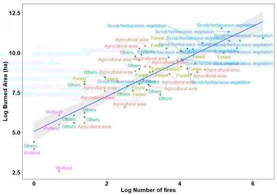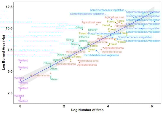 Regression relationship between the monthly burned areas and the number of fires factoring different land cover types (points and colours show the land cover types; the blue line shows the regression line while the shaded grey area represents the standard error).