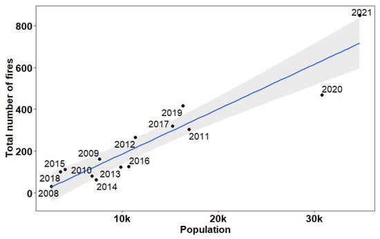 Regression relationship between total population and number of fires per year (point shows the total number of fires in each year). The number of fires refers to fires with a burned area ≥30 ha. The blue line shows the regression line while the shaded grey area represents the standard error.