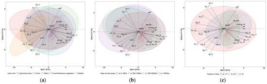 Bi plot of PCA result. (a) Land cover type, (b) the mean of burned areas in hectares, (c) the number of fires for the study area for the period of 14 years (2008–2021).