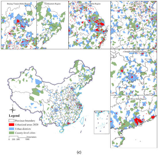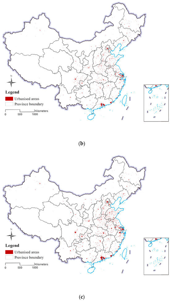 Distribution of urbanised areas in China in (a) 2000; (b) 2010; and (c) 2020.