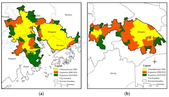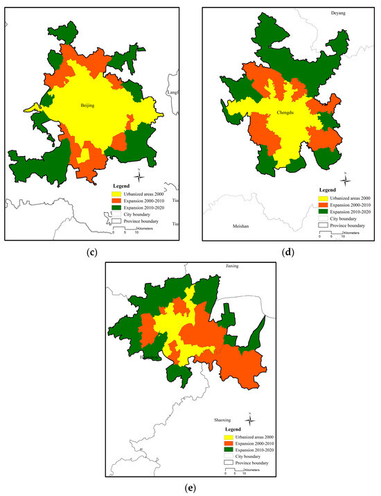 Expansion of five urbanised areas in the past 20 years before 2020: (a) Guangzhou-Shenzhen CUA; (b) Shanghai-Suzhou CUA; (c) Beijing UA; (d) Chengdu-Deyang CUA; and (e) Hangzhou-Shaoxing-Jiaxing CUA.