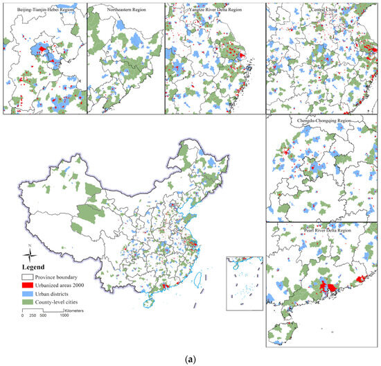 The distribution of urbanised areas and geographic scope of administrative cities in China in (a) 2000; (b) 2010; and (c) 2020.