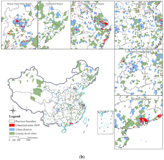 - Jiang, M.; Xi, Q. Estimating major urbanized areas in China: A population concentration approach. Soc. Sci. China 2015, 8, 26–46. (In Chinese) [Google Scholar]