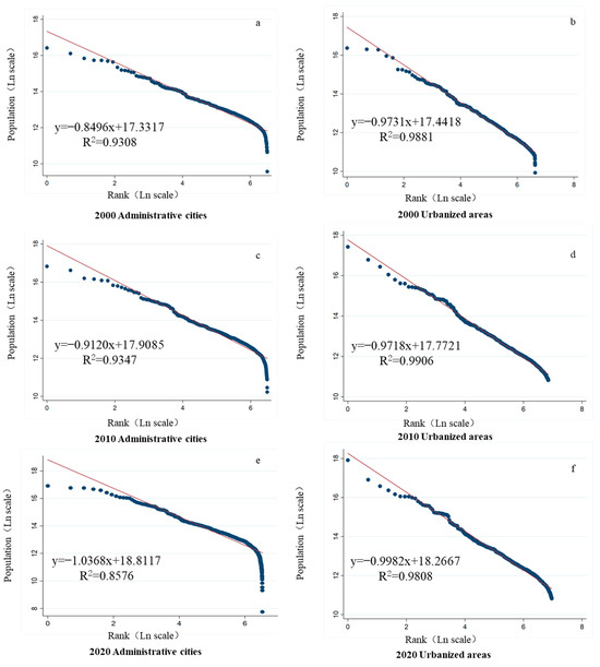 Current debates in the literature might be a consequence of the analysis unit selection, as most of these studies on city-size distribution are based on administrative cities. As mentioned earlier, China’s administrative cities fail to reflect the physical urban areas of Chinese cities. Most research regarding city-size distribution in European and American countries is based on cities defined from the physical perspective, which also leads to the incomparability of research conclusions between China and foreign countries. Therefore, this paper uses Zipf’s law to fit the identified urbanised areas and administrative cities, respectively, to better reveal the city-size distribution of China’s urban system by comparing their analysis results.