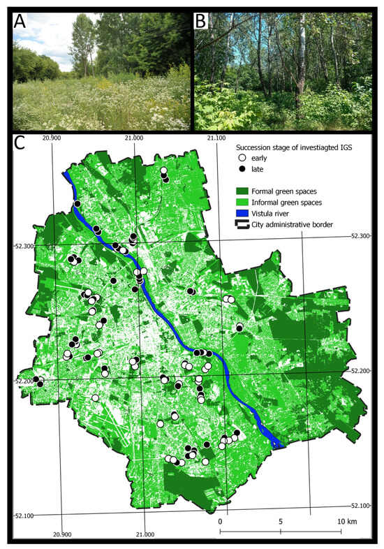 Figure 1. The investigated types of IGS: (A) non-forest IGS, permanent open habitats resulting from the management practices of selective tree and shrub removal; (B) forest IGS, habitats resulting from total abandoned management, allowing unhampered development of forest plant communities. (C) Map showing formal and informal green spaces across Warsaw, with study plots in non-forest (white dots) and forest (black dots) IGS categories.