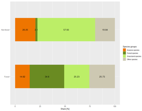 Invasive plant species made up a high share of vegetation in both IGS types, but their percentage cover seldom exceeded 40%. The proportion of invasive species also varied noticeably across different vegetation layers. In forest IGS, invasive species constituted nearly one-third of the total tree layer, at 32.79%, whereas in non-forest IGS, they made up only 3.38%. In contrast, non-forest IGS exhibited a 21.62% proportion of invasive species in the herbaceous layer, while in forest IGS, the share of invasive species in the herbaceous layer was half that size.