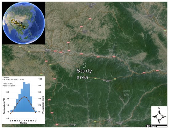The Xiaolong Mts are located in the West Qinling Mountain Range near Tianshui city and located in Tianshui area (34°26′27″ N, 106°07′29″ E, and 2085 m above sea level) in eastern Gansu Province (Figure 1). Gansu Province is locating in the southwestern sector of the erosion hotspot of China’s Loess Plateau [].