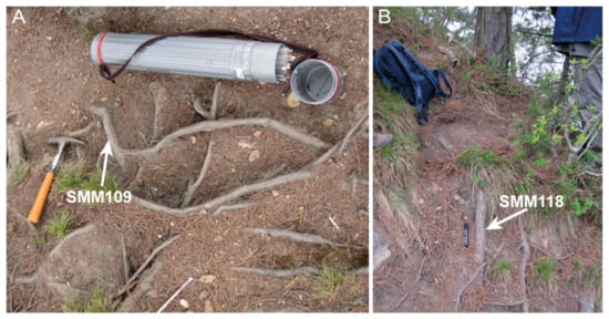 Field photos of exhumed roots. (A) A network of exhumed roots probably belonging to multiple trees. The position of sample SMM109 is shown. (B) Exhumed roots parallel to the slope. The position of sample SMM118 is shown.