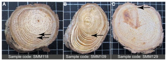 - Change from root texture to stem texture (Figure 4A). Soil-covered roots are largely protected from frost and drought. The reduced environmental signals mostly yield uniformly sized cell lumina and thin walls in the earlywood of conifer roots. Latewood is often a single row of cells only. Exposure to aboveground conditions usually yields smaller cell lumina and thicker cell walls, both in the earlywood and in the latewood. In macroscopic view, this change is displayed as lighter belowground and darker aboveground rings. Latewood is particularly affected by aboveground conditions: it is significantly thicker than the underground latewood. In short: roots produce xylem similar to that of stems after exposure to aboveground conditions [].Figure 4. Examples of exhumation markers in exposed conifer roots. (A) Stepwise change from root texture to stem texture. Light, concentric rings with narrow latewood were substituted by increasingly elliptical rings with wide latewood (thin arrow) in the year of rapid exhumation. Later, irregular rings of reaction wood (thick arrow) mark the effect of mechanical stress. Resin ducts visible throughout. (B) Distorted symmetry. Narrow rings with thin latewood belong to underground roots. Rapid exhumation yielded reaction wood of wide rings and thick latewood (arrow). (C) Wound. Gradual change from root texture (narrow rings with barely visible latewood) in the center to stem texture along the margins is observed. It is evidence for gradual exhumation. There is a wound on top (arrow) overgrown by subsequent rings and covered by bark. Brownish phenolic compounds indicate the presence of another wound, out of the plane of the section. Resin ducts visible throughout. Scale: 10 × 10 mm grid pattern in black background.