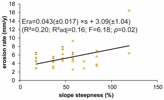 The calculated erosion rate estimates ranged from 2.6 to 16.5 mm yr−1 (Table 1). These values fit well to the published dendrogeomorphic reconstructions of erosion rates []. The limited data at hand is obviously insufficient to evaluate any potential difference related to slope facing. However, the expected positive association between slope steepness and erosion rate [,,] is well reflected in the dataset (Figure 5). It is in agreement with the findings of other dendrogeomorphic studies detecting a positive relation between slope angle and erosion rates robustly at different timescales [,]. These observations further strengthen the credibility of root exhumation-based erosion rate estimates, which is worth emphasis since a recent analysis of erosion and runoff measurements on erosion plots in non-crop land use types in China did not find a systematic association with slope gradient either with the soil losses or with the runoff rates []. The presented regression model between slope steepness as an independent variable and erosion rate as a dependent variable (Figure 5) could be used in future research to determine and to map soil denudation in this part of the Xiaolong Mts without the need for expensive instrumentation.