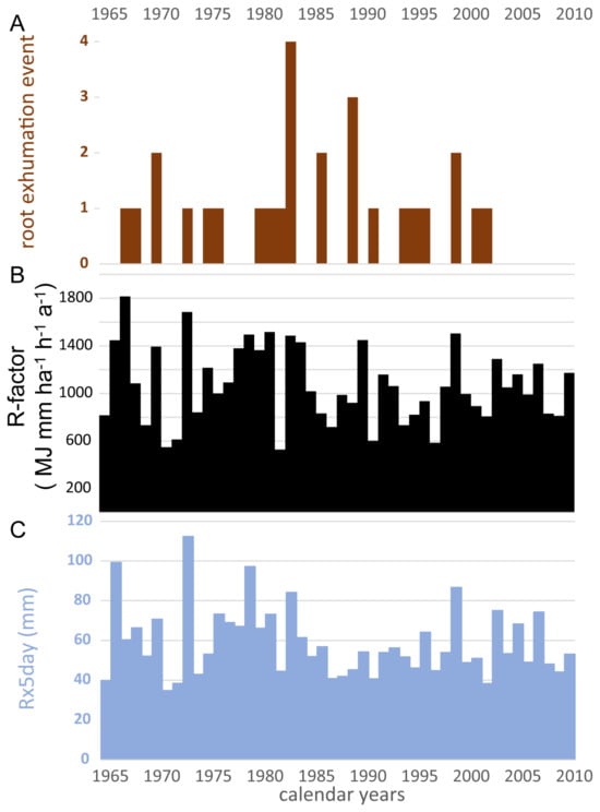 Root exhumation events documented in the Xiaolong Mts (Gansu Province, China) and annual rainfall erosivity indicators between 1965 and 2010. (A) Annual sum of detected root exhumation markers; (B) annual sum of monthly estimates of rainfall erosivity factor (Equation (2) and Section 2.3); (C) yearly maximum consecutive 5-day precipitation amount (Rx5day) retrieved from HadEX2 [] corresponding to the study site.