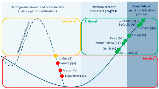 The progress from a situation of decline or abandonment to a consolidated recovery of heritage of the twelve study sites is represented in Figure 2. The vertical axis represents the degree of patrimonialization (expressed numerically with the score between brackets) and the horizontal axis represents time, although the duration of each process is different per site. The lines show the two usual pathways of patrimonialization identified, and the dots indicate where each individual site was found at the time of writing, with their score indicated [4]. The solid line tells the story of traditional salinas that were in decline or in early stages of abandonment and were recovered as artisanal sites. The scale of operation has therefore not essentially changed, although the management model may have. The dotted line, on the other hand, shows traditional salinas in decline that tried to upgrade their scale of operation by mechanizing activities, deepening brine wells or enlarging the productive area, thereby trying to prevent the closure of the site. Sites drawn in red (Arcos, Espartinas, and Peralta) are those that, despite having a recognition of their heritage values, are now inactive or abandoned, whereas those in green are active and thriving (Añana, Gerri, Guérande, Læsø, San Juan, Sečovlje, Poza, and Rambla Salada). In yellow, one site (Imón) has been found to be partially active and partially abandoned, with doubts about its survival. The blue shaded background indicates the stage at which each site is found, which is further indicated with the compound indicator value. Salinas with a value below 50 are in the first stage (Arcos, Espartinas, Imón, and Peralta), before patrimonialization; those with a value between 50 and 75 are in the second stage, “patrimonialization in progress” (Gerri, San Juan, Poza, and Rambla Salada), and those with a value above 75 are in the third stage, “consolidated patrimonialization process” (Añana, Guérande, Læsø, and Sečovlje).