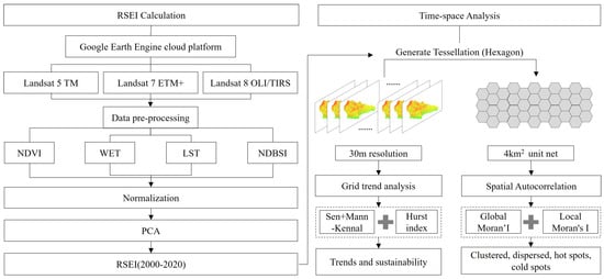 This study establishes a spatiotemporal analysis methodology for assessing the quality of regional ecological environments, comprising two main components: computation of the RSEI using the GEE platform, and conducting trend analysis and spatial autocorrelation analysis on raster data using the ArcGIS10.8 platform (Figure 2).