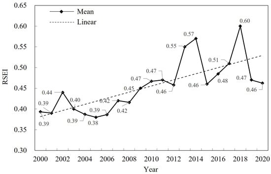 Subsequently, our study adopted the PCA method, combining the 4 metrics for forming RSEI, which was represented by the first component of PCA. Generally, it falls into five grades linearly (interval: 0.2), namely, Bad (0–0.2), Poor (0.2–0.4), Moderate (0.4–0.6), Good (0.6–0.8), and Excellent (0.8–1.0), thereby enabling a qualitative description of the ecological conditions [].