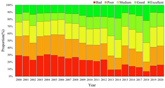 Figure 3 provides a comprehensive graphical overview of the mean change statistics in the RSEI within the Yanhe watershed from 2000 to 2020. The trend line depicted in the figure illustrates the overall upward trajectory of the RSEI, indicative of the improving ecological environment quality (EEQ) over the two-decade period. Notably, the figure also highlights significant fluctuations, especially post-2010, which can be attributed to the interplay between climate change impacts and human activities, such as urbanization, and agricultural and ecological practices. The peak in the RSEI mean value observed in 2018 corresponds with the year that exhibited the highest proportion of areas classified under the ‘excellent’ category of EEQ, as shown in Figure 4.