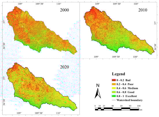 In alignment with the socio-economic development trajectory of the Yanhe watershed, Figure 3 underscores that the ecological environment quality (EEQ) has undergone notable variations since the year 2010. To capture these dynamics, our analysis is segmented into three distinct chronological phases—years 2000, 2010, and 2020—to provide a focused examination of the spatiotemporal distribution of the RSEI.