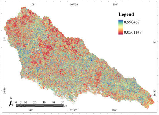 To further analyze the consistency of the RSEI change trend, the R/S analysis was used to calculate the Hurst Exponent pixel by pixel to obtain the sustainable spatial distribution of the RSEI change trend in the Yanhe watershed. The Hurst Exponent’s overall threshold ranges from 0.06 to 0.99, with an average of 0.69. In Figure 7, the area with a Hurst Exponent higher than 0.5 accounts for 88.66% of the entire watershed, which is widely distributed and mainly concentrated in the upper and middle reaches and lower reaches of the watershed, indicating that the future RSEI change trend of the Yanhe watershed will be consistent with the changing trend from 2000 to 2020. That is, the RSEI will be on the rise in the future, and the EEQ will be improved continuously. The proportion of regions with a Hurst Exponent lower than 0.5 is 10.96%, mainly found in the middle and upper reaches, indicating that the RSEI of this region presents anti-sustainability, and the EEQ will decline in the future. Furthermore, the region with a Hurst Exponent equal to 0.5 is only 0.37%. Therefore, on the whole, the EEQ change in the Yanhe watershed in the future has a trend of improvement, and sustainability is strong.