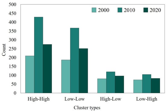 The LISA map, a product of the local autocorrelation analysis, offers a nuanced perspective on the spatial–temporal distribution of the RSEI. The years 2000, 2010, and 2020 each exhibit distinct high–high (H–H) and low–low (L–L) cluster areas within the Yanhe watershed, signifying significant positive spatial correlation and agglomeration patterns. Notably, there is considerable fluctuation in the extent of these clusters across the three periods. The H–H clusters increased by 219 grid cells from 2000 to 2010, and then decreased by 154 by 2020. Similarly, the L–L clusters saw an initial rise from 187 in 2000 to 367 in 2010, followed by a decline to 251 by 2020 (Figure 8).