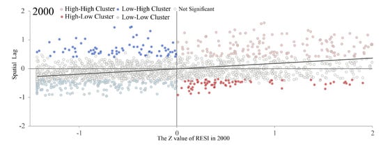 Moran’s I scatter diagram of RSEI in 2000, 2010, and 2020.