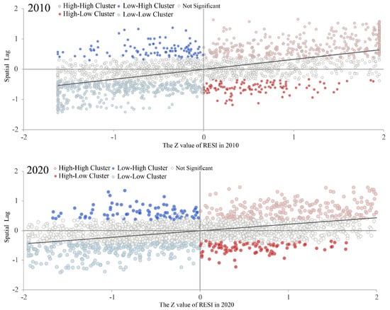 As shown in Table 3, the Moran’s I index is consistently larger than 0, and the p-values are <0.01, indicating that the RSEI presents a significant spatial autocorrelation. The Z-scores are all greater than 2.58, indicating that the null hypothesis cannot be accepted, and the ecological index has an agglomeration state in the spatial distribution. From the long-term series, the spatial agglomeration of the RSEI in the Yanhe watershed is enhanced as a whole, and the agglomeration is higher in 2010.