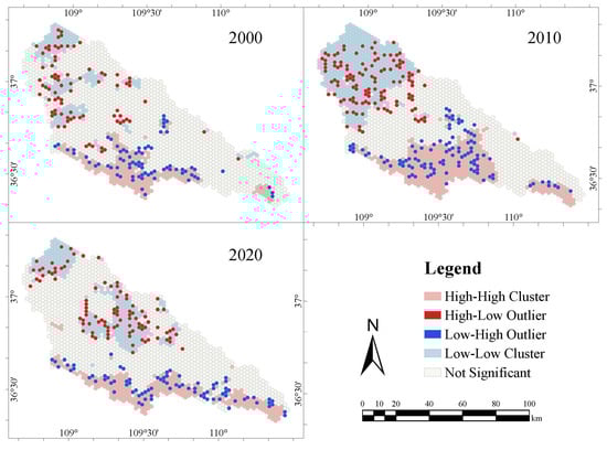 LISA map of RSEI local spatial cluster analysis in Yanhe watershed in 2000, 2010, and 2020.