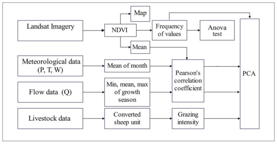 Principal Component Analysis (PCA) was conducted to illustrate the general pattern of the parameters such as NDVI values, the hydro-climatic variables, and GI using CANOCA [53]. Linear regression was used to test for relationships between mean NDVI and livestock density.