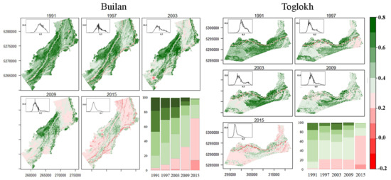 Figure 3. The spatial difference of pixel−level NDVI changes in Builan and Toglokh bags for every sixth year from 1991 to 2015. The inset histograms illustrate NDVI value frequencies. Bar charts summarize the changes in areas covered with specific NDVI values for the census year.