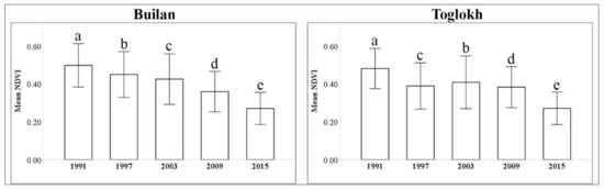 Pixel-level NDVI values in the two floodplains declined from 1991 to 2015 (Figure 3). Over time, high NDVI values (>0.4) consistently decreased. The values of 0.7 and 0.8 no longer existed by 2015. As a result, the maximum values shifted from approximately 0.45 to around 0.25, which was the prevailing value for the adjacent highland steppes. Additionally, the area covered by a certain range of NDVI values shifted greatly over time (Figure 3, bar charts). For example, areas covered by 0.3 values increased by 22 times in Builan and 44 times in Toglokh, while areas covered by 0.6 values decreased by 23 times in Builan and 17 times in Toglokh. Finally, the NDVI variability increased in 1997 and 2003 and decreased in 2009 and 2015 for both plains (Table 2).