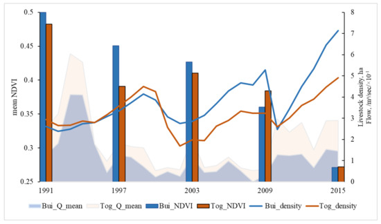 Figure 5. Comparison of the mean NDVI with the yearly livestock density and summer mean flow. If the density is up to 2 head of sheep per hectare, the GI is light, 2–4 is moderate, 4–6 is heavy, and more than 6 is extreme. The years 1991–1995 were high, 1996–2009 were low, and 2010–2015 were medium−flow years.
