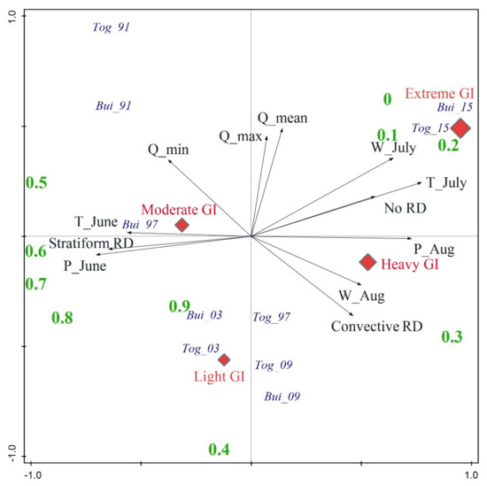 Figure 6. The PCA ordination of two floodplains (Tog = Toglokh bag, Bui = Builan bag) with data from every 6 years from 1991 to 2015. Green numbers = NDVI values, Q = runoff, T = temperature, p = precipitation, W = wind, RD = rain days, GI = grazing intensity.