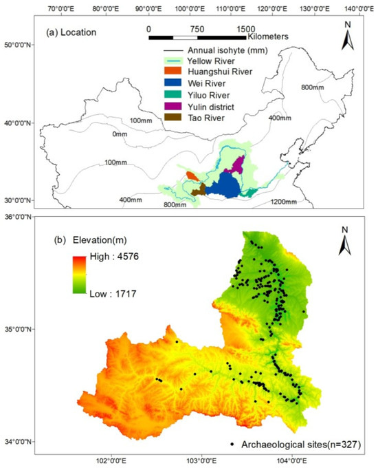 Locations of the river valleys in this study (a) and distribution of archaeological sites in the Tao River valley (b).