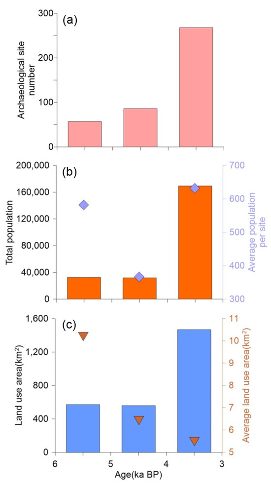 The average reconstructed population and land use per archaeological site showed the changes in settlement size between 6 ka BP and 3 ka BP (Figure 2). About 70% and 64% of the archaeological sites had a population size of <500 persons and a land use area of <500 × 104 km2 during each millennium, while only <10% and <12% of sites had a population size of >1500 persons and a land use area of >1000 × 104 km2. These large-size settlements were usually distributed in the conjunction areas of rivers, while archaeological sites with smaller areas were often distributed around larger ones.