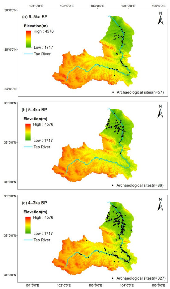 Spatial changes in archaeological sites in the Tao River valley from 6 to 3 ka BP: (a) 6–5 ka BP; (b) 5–4 ka BP; and (c) 4–3 ka BP.