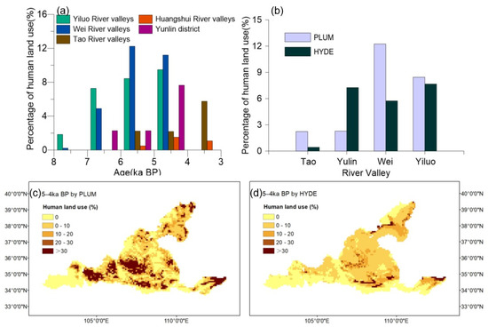In a temporal sense, the reconstruction using the HYDE revealed that the percentages of land use in the upper reach were significantly lower than those in the middle reach; the values of land use percentage during 5–4 ka BP in the middle reach were similar (all about 6–7%). However, the reconstruction using the PLUM indicated that the percentages of land use in the surrounding areas of the middle reach (the Yulin district) were also as low as those of the upper reach (the Tao River valley), and the human activity intensities in the core agriculture development areas of the middle reach (the Wei and Yiluo River valleys) were much higher (Figure 5b). In a spatial sense, the variations in the reconstructed land use distributions in the upper and middle reaches of the Yellow River valley, according to the PLUM, were more significant than those with the HYDE (Figure 5c,d).