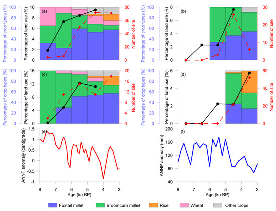He et al. (2022) [21] further explored the spatiotemporal evolutions of the main crop types (millet, rice, and wheat) in different cultural regions of north China based on a comprehensive dataset of archaeobotanical macro-remains. The five areas with quantitative land use reconstruction were distributed inside these different cultural regions (the Yiluo River valley–Central Plains culture region, the Wei River valley–Guanzhong culture region, the Yulin district–Yanbei culture region, and the Tao and Huangshui River valleys–Ganqing culture region); therefore, a comparison of land use percentages, the total number of archaeobotanical macro-remains, and their floating results can further reveal the impact of agricultural development on land use (Figure 6a–d).