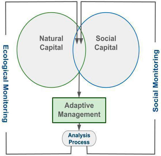 Therefore, social capital is closely involved in the management of natural capital and the acceptability of environmental policies [45,50]. These ideas are central in adaptive management to global change because when the population considers that the protection of biodiversity, its natural capital and ecosystem services, and social, economic, and cultural capital are related, the population’s involvement in protection increases [73,74]. For conservation and resilience strategies to be implemented effectively and management resources not to be wasted, social structures must be part of the process. Involve local governments, civil society, each individual, and the private sector [75]. In short, the measures adopted by management must be legitimized by the society itself (Figure 1) where they are implemented [15].