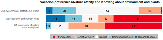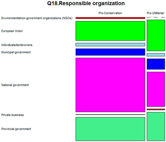 To assess the level of commitment to biodiversity conservation shown by respondents, a series of questions are asked that progressively lead to greater involvement. Therefore, it entails a greater “cost”, whether for personal, economic, emotional or ideological reasons. To measure this possible change in responses, respondents were aggregated into two opposing groups: pro-conservation and pro-utilitarian. The construction of these groups is performed on the basis of the questions that imply a commitment (Table 1), from those that are more generic and with little involvement (Q9 or Q12) to those others where the level of involvement increases gradually and in different aspects (Q13, Q14, Q15 and Q16). The intent is to involve personal interaction, limit private property rights, and limits on industrial development. In such a way that both groups are defined as follows: (1) Pro-conservation, those who maintain their level of commitment in a coherent way in absolutely all their responses; (2) Pro-utilitarian, those who modify their level of commitment or change to non-committal (does not know/does not answer) in some of them.