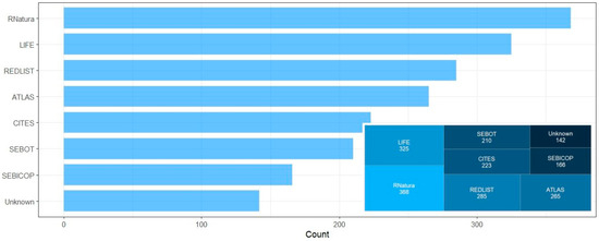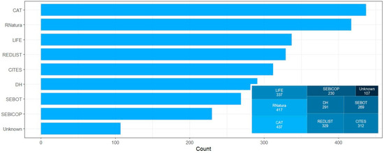 In Spain, the value of natural resources per inhabitant is 34% higher than the EU-27 average. Natural capital endowments per capita are around EUR 9000/per capita [59]. Simultaneously, in the European context, it is possibly the country with the highest risk of biodiversity loss, which has resulted in it also being the European country where the most threatened PA and flora species exist, reaching 25.33% of the total European. As an example, the IUCN Red List of Threatened Species lists 291 threatened plant taxa in Spain. But the latest revision of the red list points to a total of 1145 threatened taxa (10.92% of the country’s total vascular flora), of which only 234 would be protected by Spanish national and/or regional legislation (20.44% of all threatened flora) [81,89]. In a context of climate change in a very vulnerable region such as the Mediterranean, in addition to hosting numerous species at its distribution limit with the fragility that this entails.