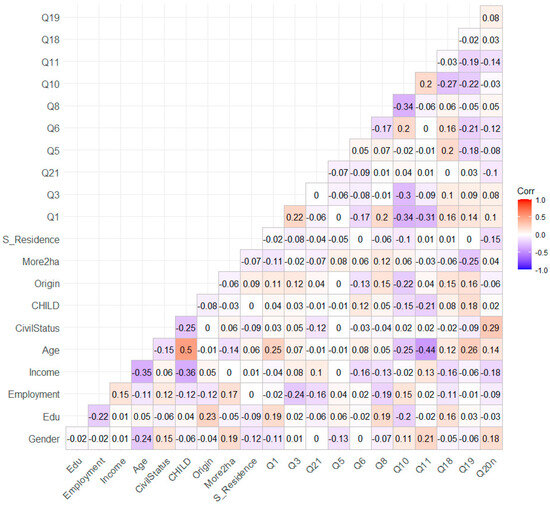 The population under study is the Spanish population between 15 and 74 years old. The use of the survey has been chosen as a quantitative data production technique, considering into account in its interpretation the small deviation caused by the differences between declared and revealed preferences [104,105]. Although the questionnaire was developed in-house, it is based on previous polls on this subject [106,107,108] and consists of a battery of questions divided into three main blocks. Each main block previously established shows three different scenarios where the respondent is gradually proposing measures more committed to the conservation of each threatened species and the legislation that protects them. Each block allows the analysis to determine whether the responses are determined by any of the main aspects included in each block. These are: individual encounters, private property and industrial development. According to the allowed answer, the type of survey is closed, in almost all cases except for the questions related to an unrestricted economic amount (Q20.Investment in protection) and Age, with an open response, aimed at obtaining a figure. The complete data pool comprises 21 questions (Table S1) and 11 sociodemographic questions (Table 1). In addition to the three blocks already mentioned, other issues related to the environment, the conservation of biodiversity and threatened flora are added. Most of the questions are categorical variables with 2–7 levels.