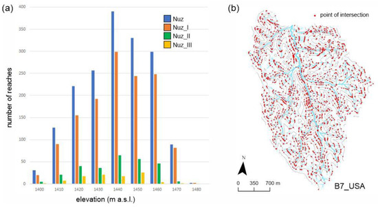 Similarly, we could also represent the number of reaches of each hierarchical order (Nuz_I for the first-order reaches, Nuz_II for the second-order, and so on). These representations allowed us to verify the arrangement and, specifically, the number of reaches for each hierarchical order as a function of their elevation (represented along the x-axis) (Figure 4a).