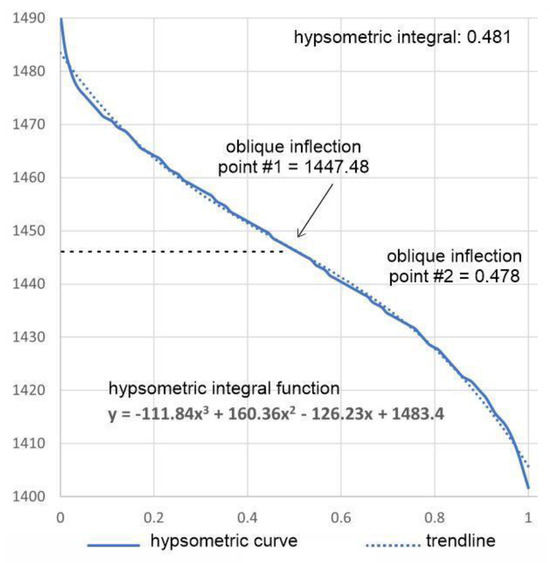 Example of a hypsometric curve with the indication of value and location of the relative oblique inflection points (OIPs).
