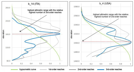 The curve in the graph represents the number of reaches of first, second, and third order as a function of the elevation. We normalized this number to 1 to make it comparable with the hypsographic curve (light green in the graph). Moreover, it was possible to identify the highest altimetric belt, where the greatest number of hierarchically classified reaches of a given order (in our case, the third order reaches) drain a greater basin area.