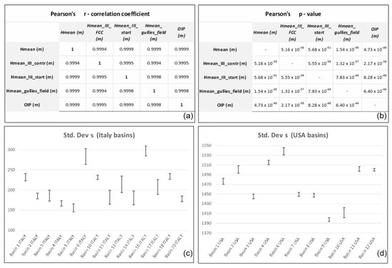 (a) Pearson’s “r” correlation coefficient; (b) Pearson’s “p” value; (c,d) standard deviation σ calculated among the “heights” evaluated with different methods in the Italian and the US basins, respectively.